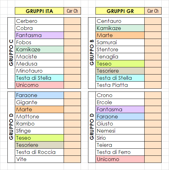 qui sotto: Fantasma, Faraone, Kamikaze, Marte, Teseo, Tesoriere, Testa di Stella, Unicorno.